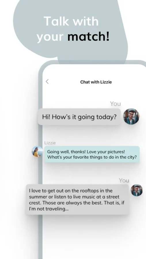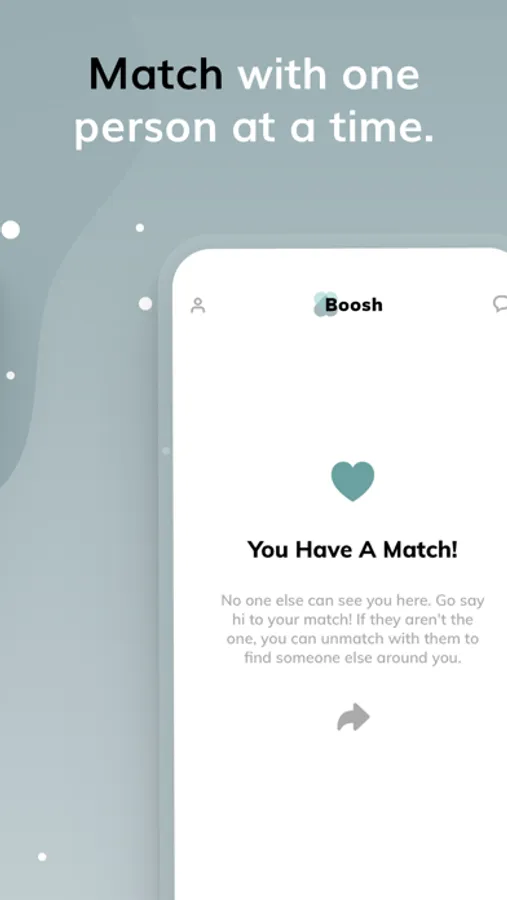 Search and match with users close to you. Once you match, you talk exclusively with that person and no one else! If it's a match, awesome! Ride off into the sunset. If not, feel free to un-match them and get back into the sea, as one would say.