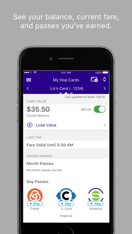 Use the Hop app or website to manage multiple virtual and plastic Hop cards, see recent transactions, load money on your Hop cards, or set up Auto-Load so you’re never stuck without fare. You can also keep track of your balance, your time remaining on your ride and your progress toward earning a day or month pass.