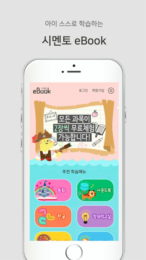 스마트폰/태블릿만 있으면 유아 전과목 학습이 가능한 시멘토 eBook! 한글, 수학, 영어, 한자, 사회/과학, 사고감각, 미술음악, 동화, 사운드북, 두뇌개발 등 다양한 과목을 아이 스스로 자기주도적으로 학습이 가능합니다. 모든 학습지는 음성이 지원되어, 아이 스스로 재미있게 학습이 가능합니다.