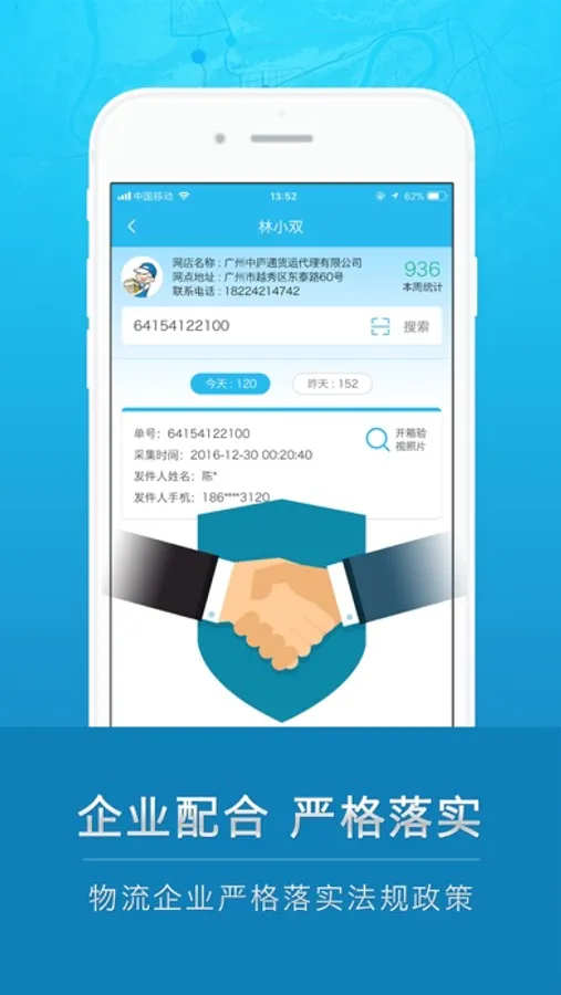 根据国家邮政局的物流快递行业需要严格落实3个100%的规定:即100%实名登记、100%开箱验视以及100%过X光机。结合物流寄递行业的业务特点,经过多方调研,利用现代物联网、互联网、智能化、云计算、大数据等信息化技术,物流寄递管控平台系统应运而生。本平台由政府研发,统一推广。是集物流快递企业管理、从业人员管理、实名登记、开箱验视、实时预警等多功能的一套辅助政府开创物流管控的科技创新平台。主要功能如下: