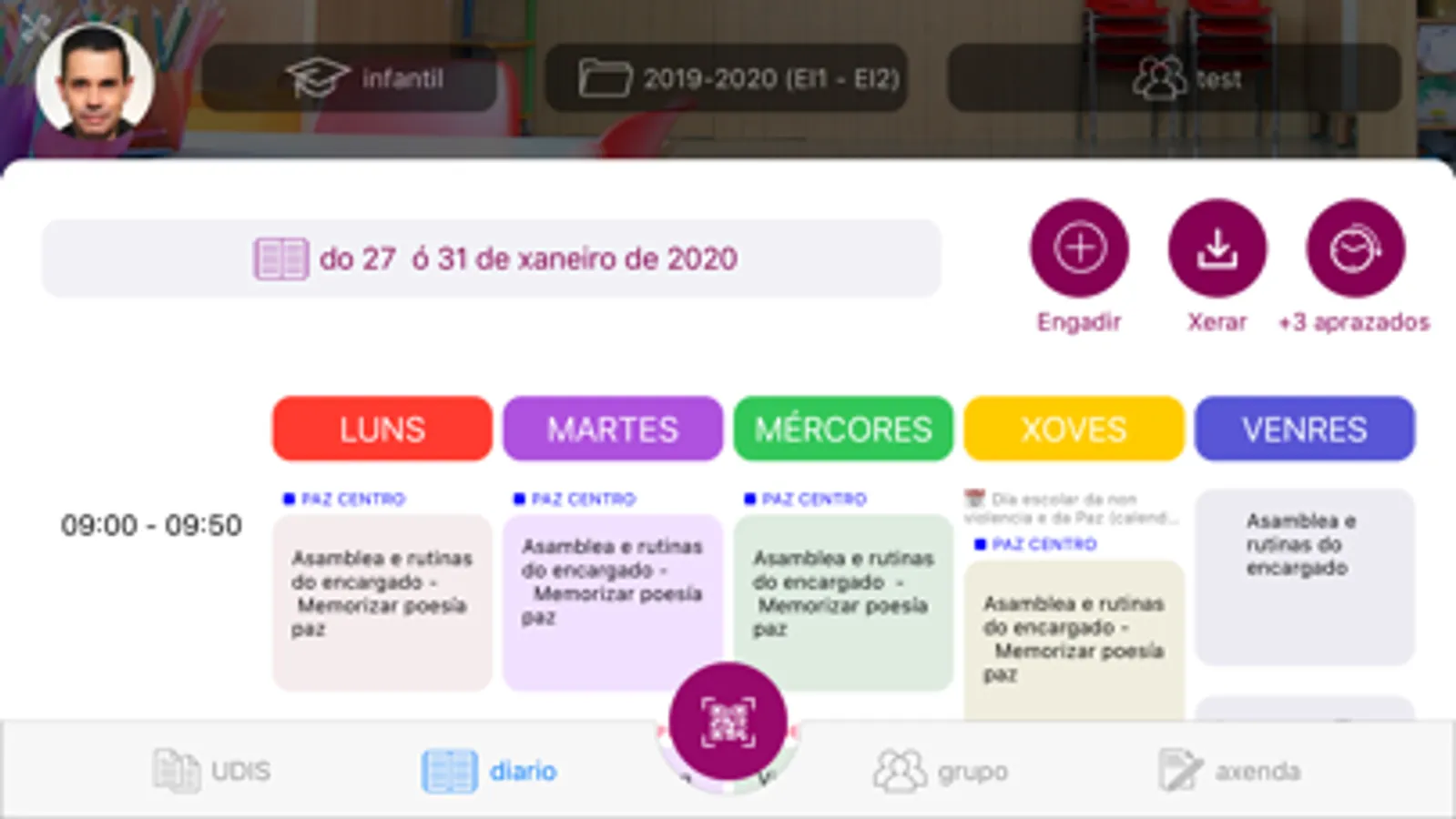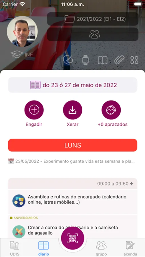 - Levar á práctica as semanas do teu diario de clase, xa que poderás ver o que tes planificado para cada sesión. O apartado correspondente situarase automáticamente no día actual da última semana creada.