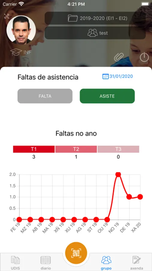 - Poderás ver a evolución das faltas de asistencia do alumnado, sincronizadas, co calendario de aula online dispoñible na web. Podendo tamén modificalos e engadilos directamente desde a App..
