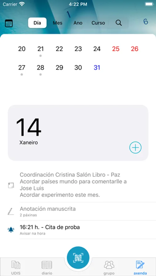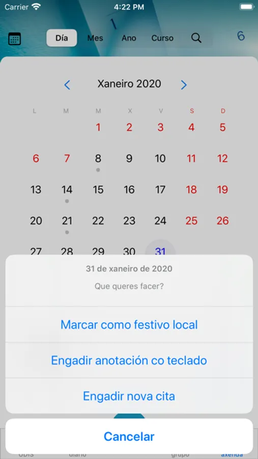 - Poderás engadir citas, incluíndo avisos como notificacións co tempo de antelación que sinales.