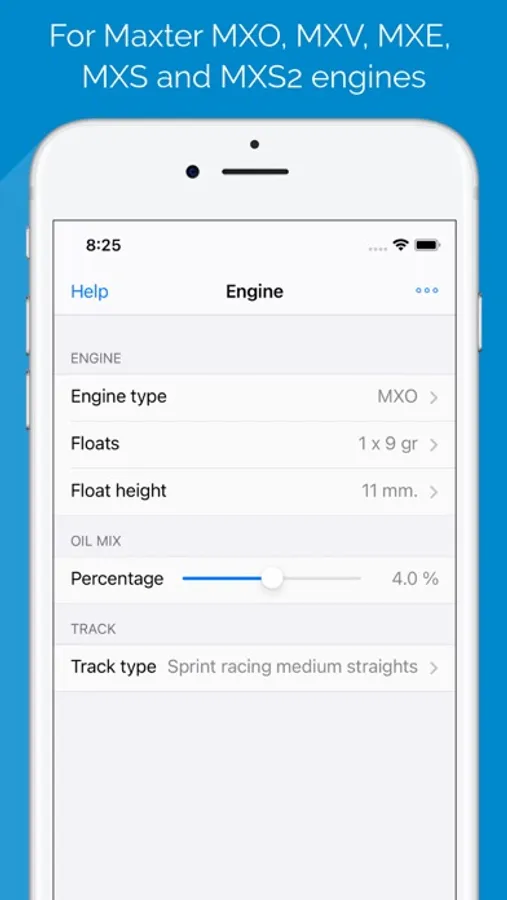 - Engine: you should set in this screen the information about the engine and the carburator (Dellorto VHSH 30), that is, the engine model (Maxter MXO, MXV, MXE, MXS and MXS2), the float type and height, the oil mix ratio and the type of the circuit (sprint or road racing, short or long). Depending of the track type, the jetting setups will be adapted.