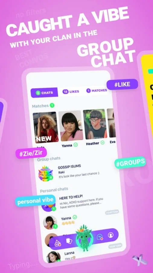 Look deep into your mind and heart through a quiz. Discover yourself through a cute virtual totem that helps people see you from new angles. Use our estimate of your mental age as a different way to describe yourself. Get to know people of all backgrounds, genders, sexualities, and appearances that you connect on another level with. Customize and take care of your totem. Become a part of the community in chats assembled by personality type. Play through our challenges, show off your achievements. Build new experiences at the intersection of romance, sex, friendship, and camaraderie.