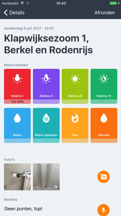 Per adres, overzichtelijk weergegeven per dag, kunnen een onbeperkt aantal foto's worden genomen, incl. eventuele notities. Ook het noteren van de diverse meterstanden en het ondertekenen van de inspectie door de aanwezige partijen kan via deze app.