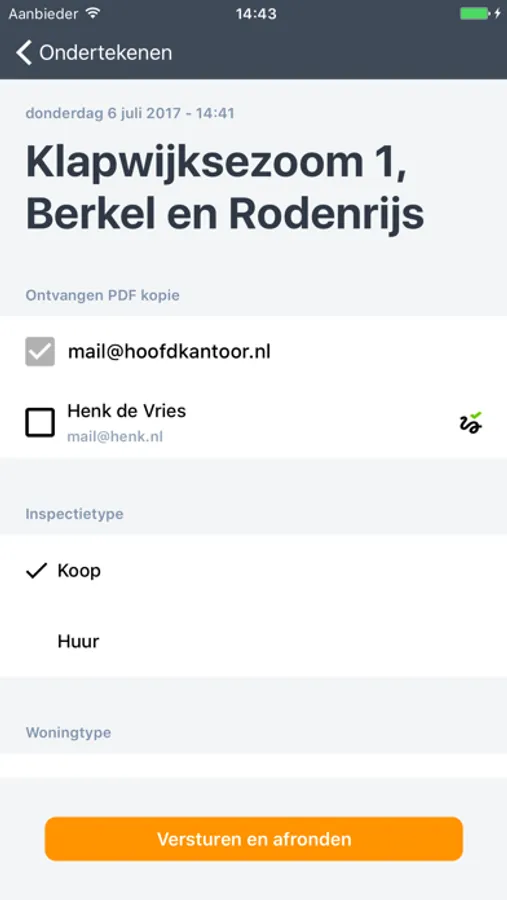 Na de inspectie krijgen de aanwezigen (optioneel) een e-mail toegestuurd met een overzicht van de afgeronde inspectie, incl. handtekeningen, meterstanden en foto's.
