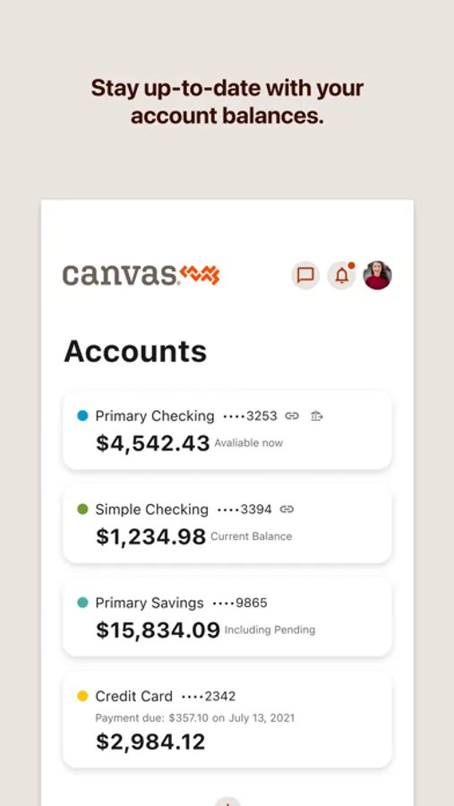 The Canvas app lets you bank on the go so you can stay focused on the moment. Easily check account balances, deposit checks, track spending, apply for loans, and so much more. With the Canvas app, the banking tools you need to afford life are in the palm of your hand.