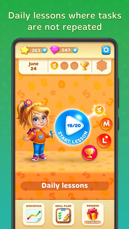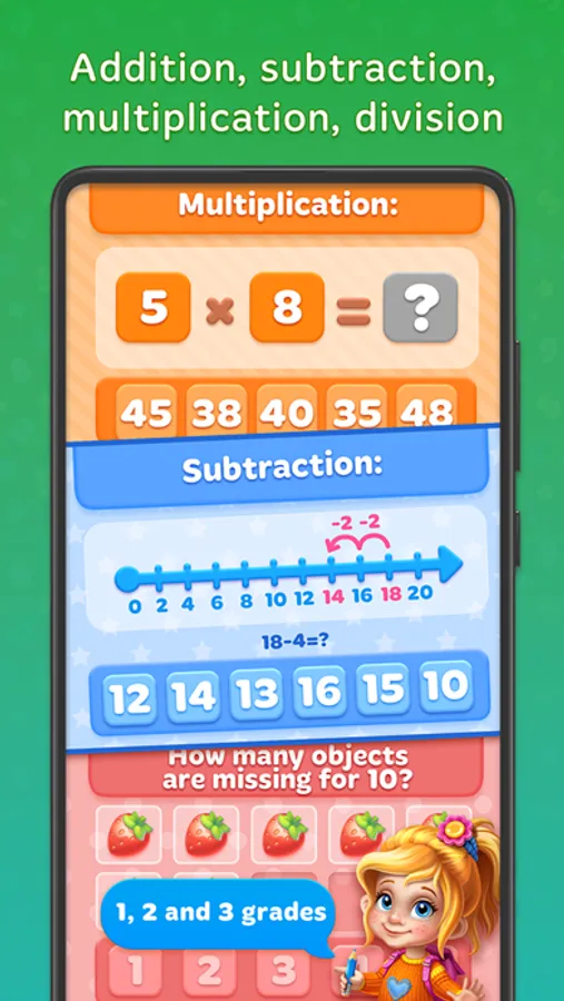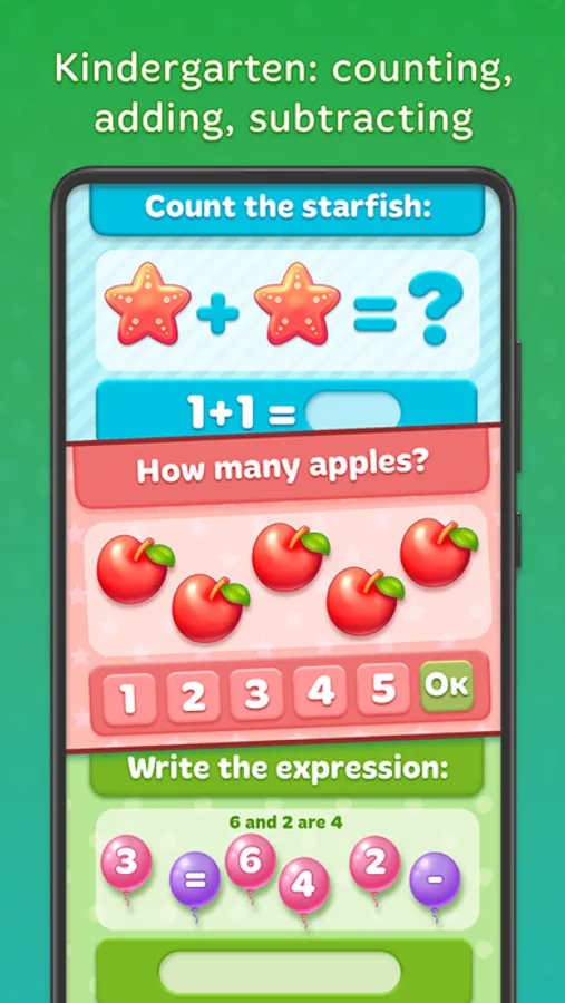 Game has several difficulty levels such as Beginner and Expert. While you’re at the Beginner level your kid will learn arithmetic with numbers, digits and basic mathematical operations: addition, subtraction in scope of 20. Also Beginner includes several mini games for basic geometry. At the Expert level your kids will learn same addition, subtraction but we also add multiplication and some algebra related mini games. Kids will continue to learn geometry at Expert level. Expert level plays with digits in scope of 200.