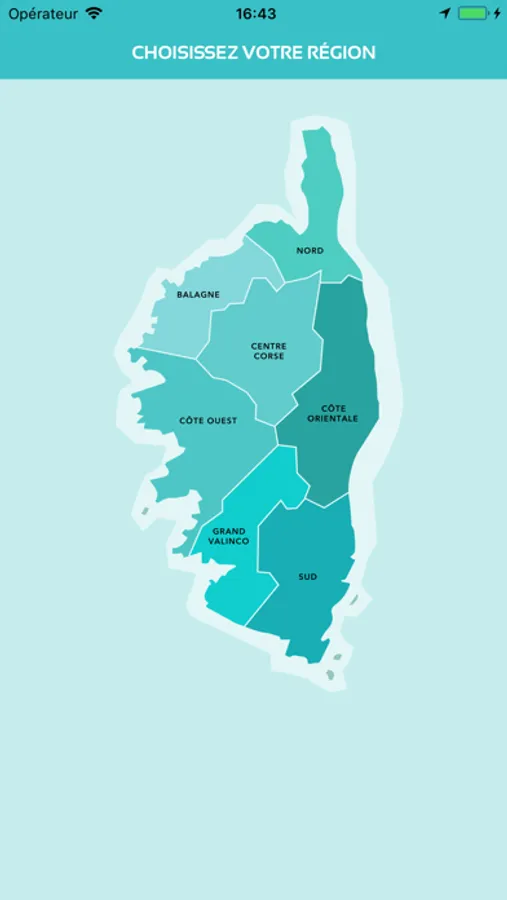 Interactive map of Corsica with regions and micro-regions clickable directly on the screen
