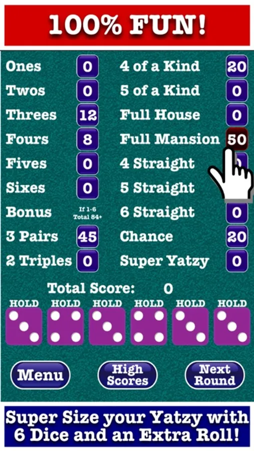 Super Size your Yatzy dice fun with six dice and an extra roll!