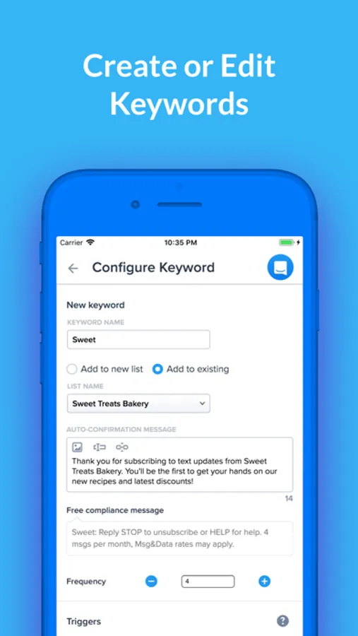 • Add or edits keywords that users can text to subscribe to your messages