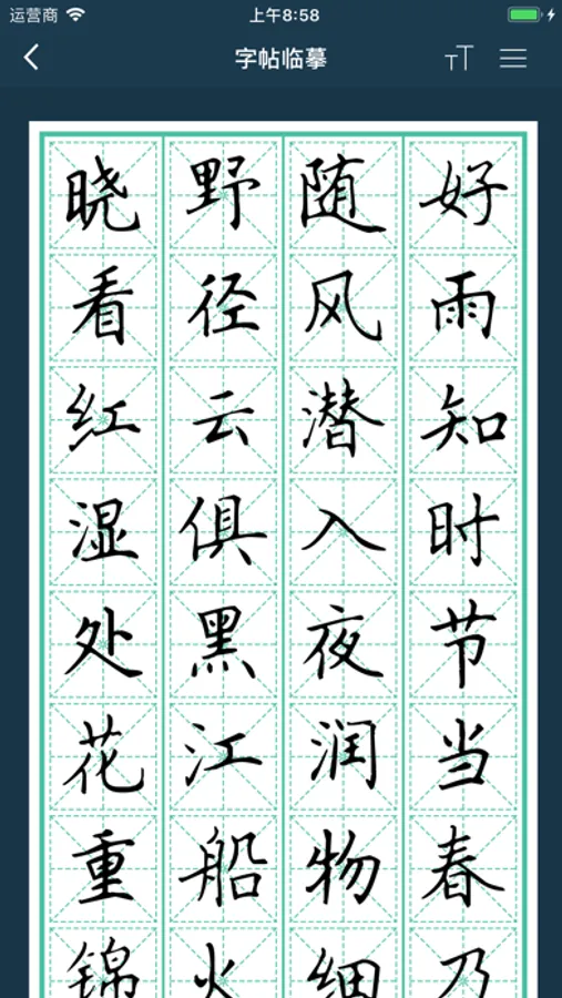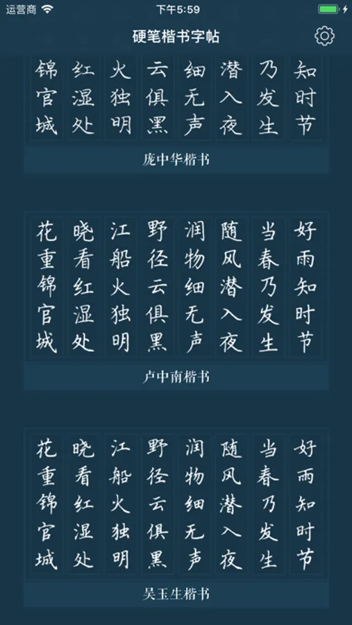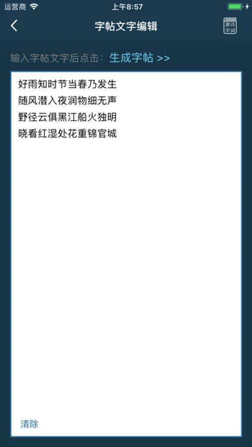 输入文字即可生成多种字体的硬笔楷书字帖,可手写临摹。内置唐诗、宋词、元曲上千首用于生成字帖。