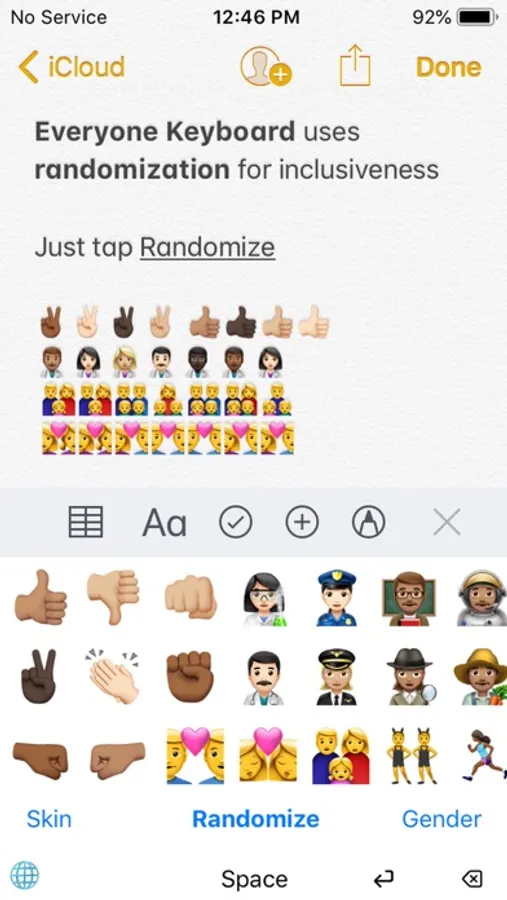 This custom emoji keyboard randomizes the skin colors and genders for emoji hands, professions, and relationships, taking some bias out of your emoji selections.