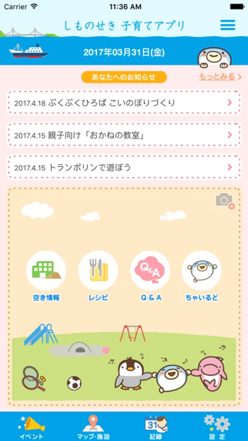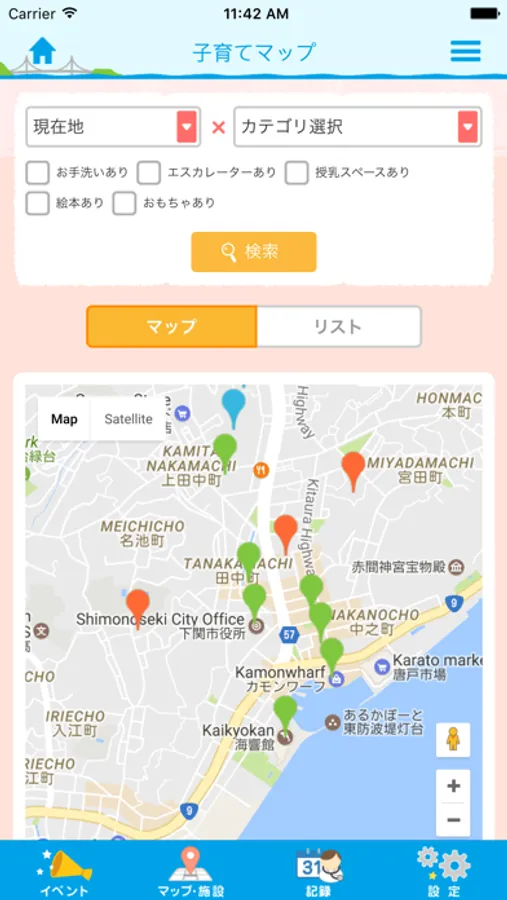 イベント開催場所や、赤ちゃんの駅等、市内の子育て施設を検索できます