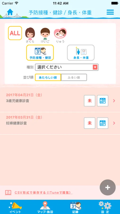 忘れがちな予防接種・検診の予定や、身長・体重を記録してみましょう