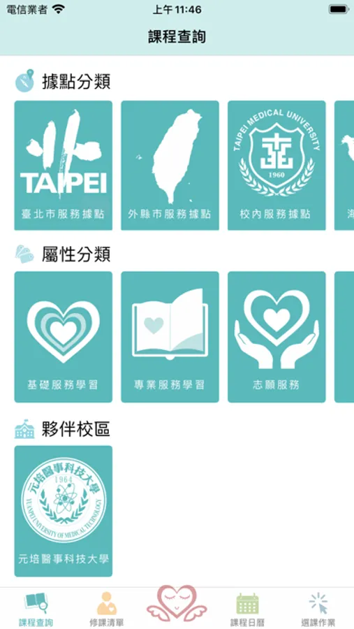 1.課程查詢:可依照類別及據點查詢服務學習課程。
