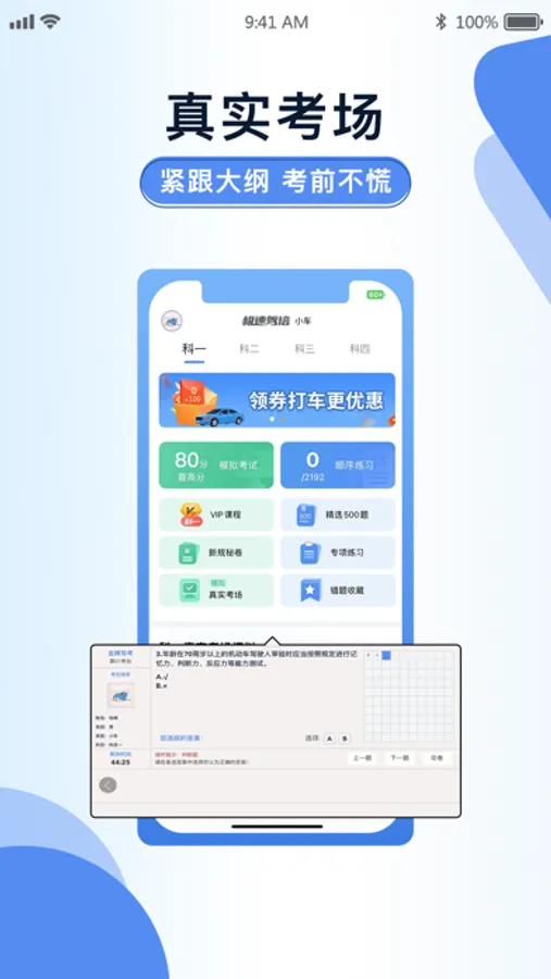 本APP是为各驾考学员服务,本系统具有理论学习,模拟考试,视频学习,理论在线计时,模拟计时和实操计时功能