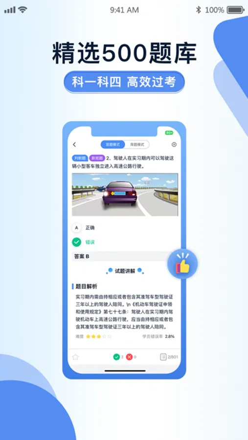 1、理论学习:为您提供科目一和科目四理论学习,各种训练模式,包括顺序练习,随机练习,强化练习和专项练习功能,具有错题收藏功能并与云同步,确保您在不同的手机上都能够看到自己做过的题