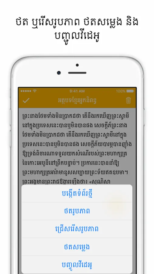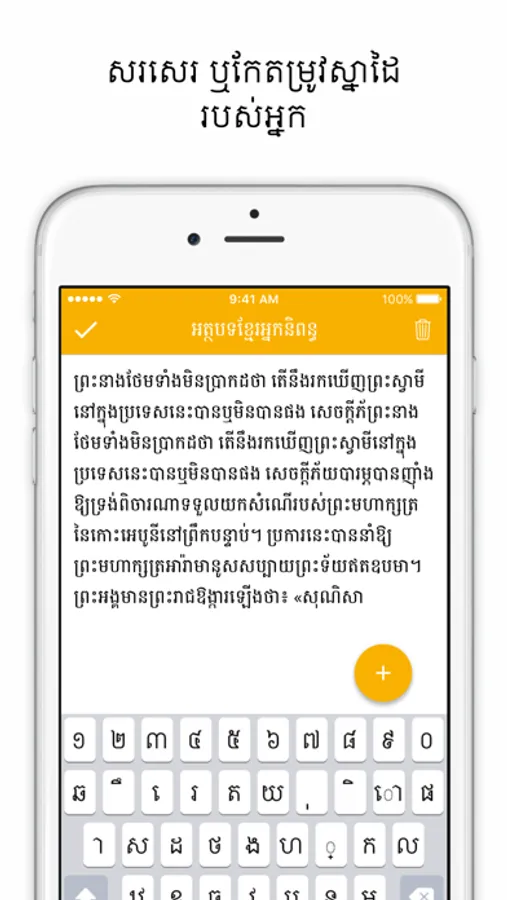 Khmer Writer is an application enables users to create their own content such as short stories, books, supported by audio and/or visual features, pictures, videos, made available for download after meeting criteria. The app will make it possible for individual authors to generate new content for Khmer Library app. Moderation by project staff and national writers associations in addition to annual competition will ensure highest quality.