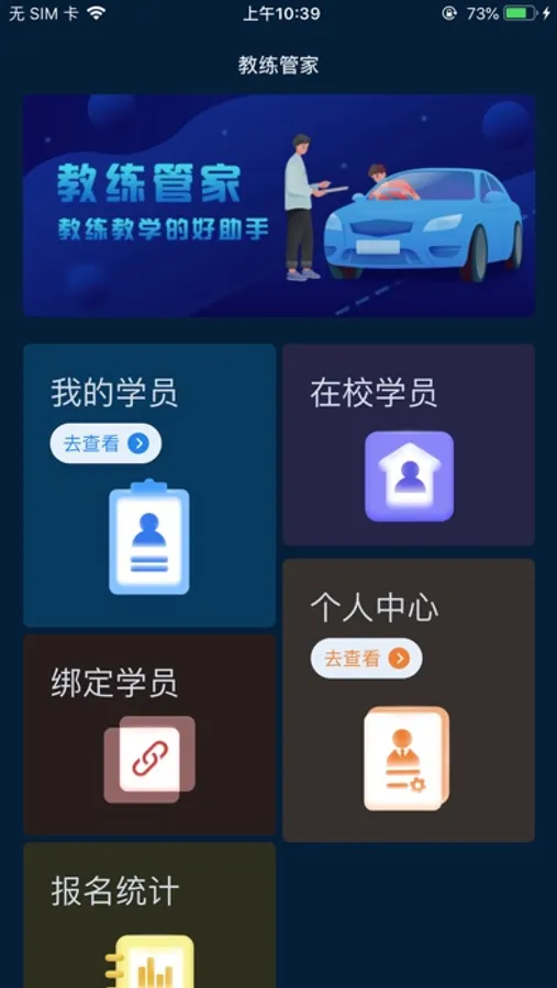 教练管家跨驾校版是专注教练教学使用的APP,旨在帮助教练更好的完成教学任务,有管理学员,日常办公等功能,结合我们运管的数据资源,可以帮助教练实现互联网教学并提供个性化服务,其主要功能包括了:我的学员,绑定学员,报名统计,个人中心这几大模块。