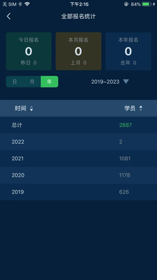 3、报名统计:统计教练的报名人数,根据日,月,年来统计。