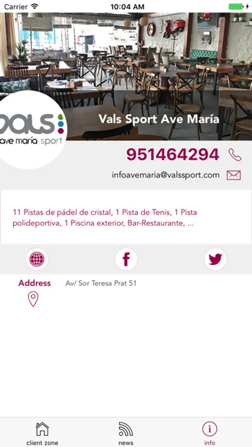 - Información del club, teléfono, mail, redes sociales, y acceso a mapa para llegar sin problemas.
