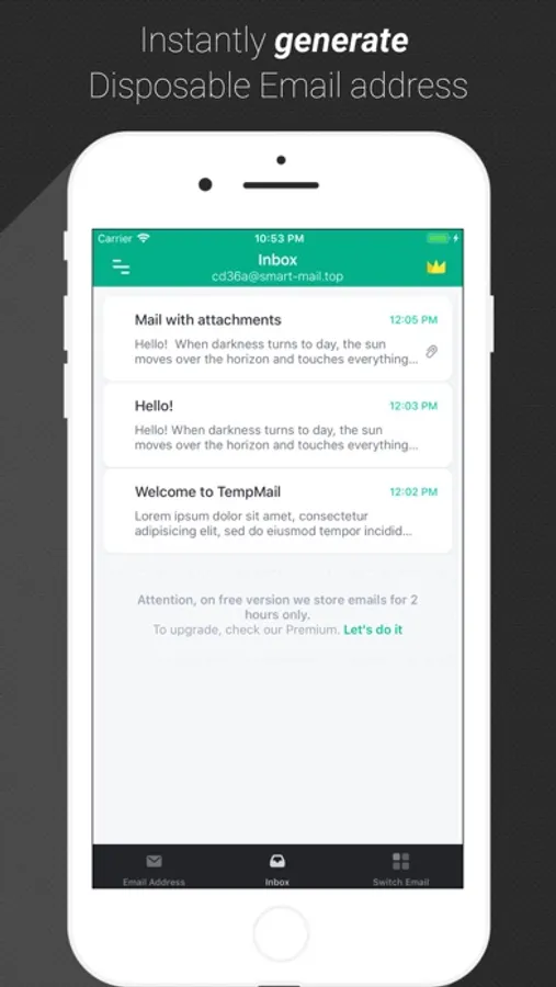 Using Temp-Mail app, you can instantly generate disposable temporary email address and immediately receive emails, including photos or any other attachments.