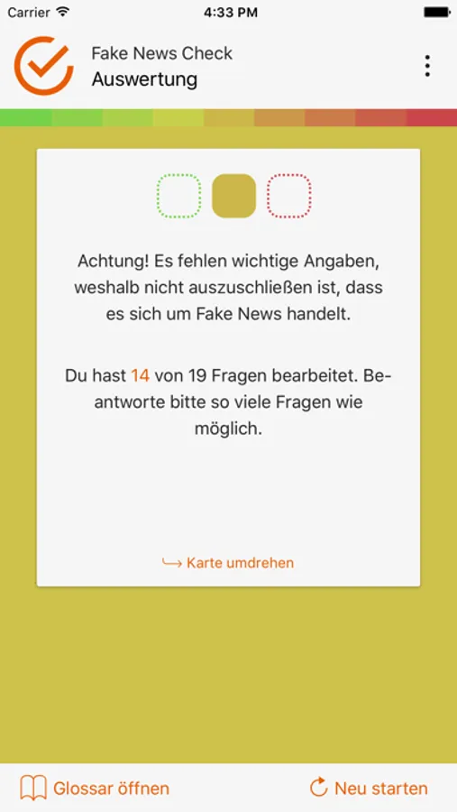 Die Auswertung des Fake News Checks orientiert sich an den klassischen Ampelfarben. Je nachdem, ob eine Antwort eher für oder gegen eine Fake News spricht, ändert sich der Hintergrund der App in Richtung Rot, Gelb oder Grün.