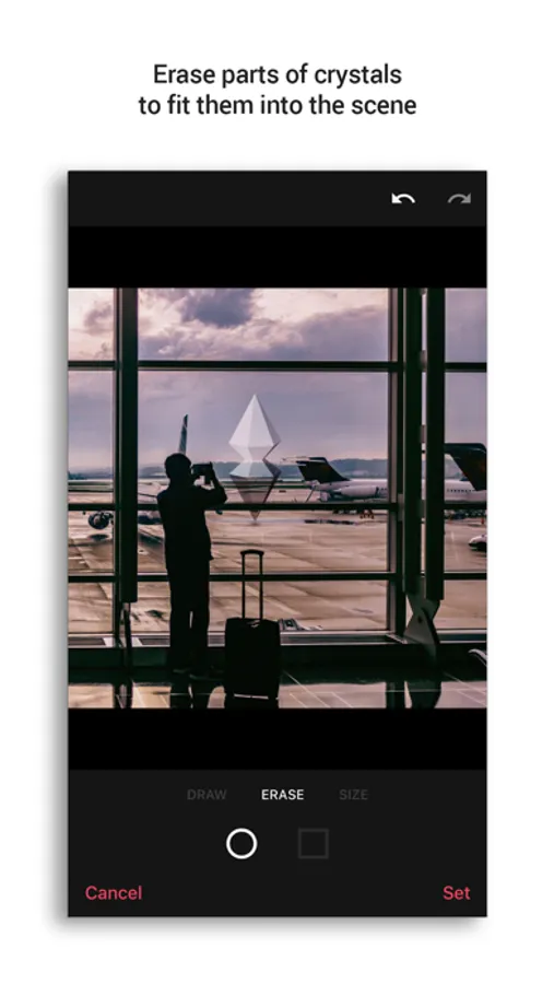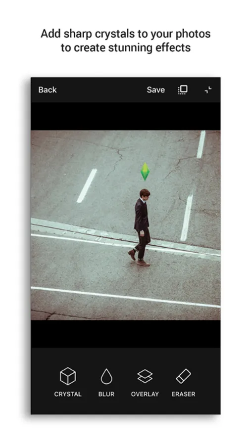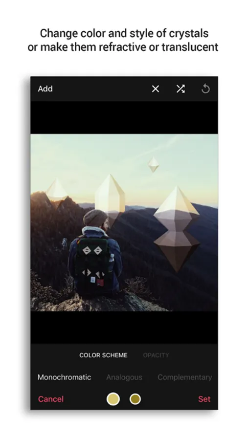 Simply snap a shot or upload a photo and let your imagination take over. Select a crystal, then drag it, resize, rotate and zoom, choose colors, adjust opacity, add blur effects or mask out portions of the crystal—whatever inspires you. When you’re done, easily share your edit with friends or continue editing by adding more crystals. It’s that easy.