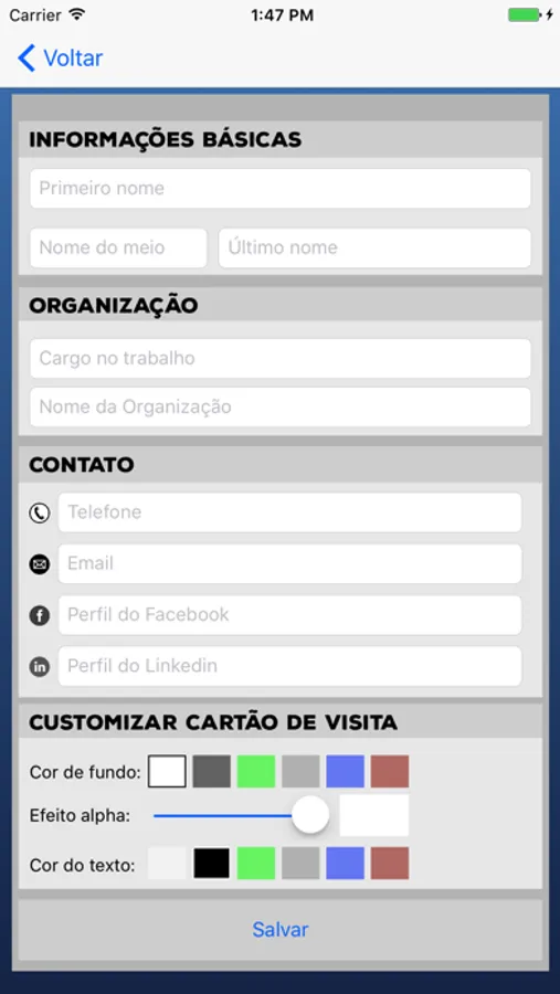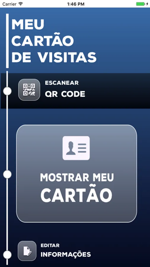 Aplicativo voltado a criação de um cartão de visita personalizado com QrCode. O app permite customizar informações, assim como o design do cartão (cor de fundo e cor do texto).