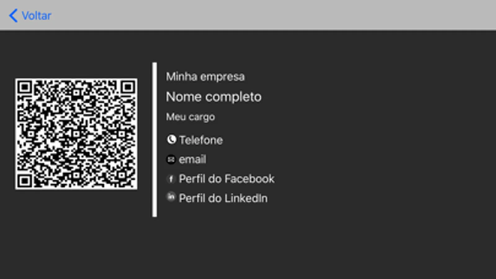 Com o qrCode, outra pessoa que possua o mesmo aplicativo poderá ler esse qrCode, e de forma automática adicionar as informações do cartão de visita na lista de contato pessoal do seu iPhone.
