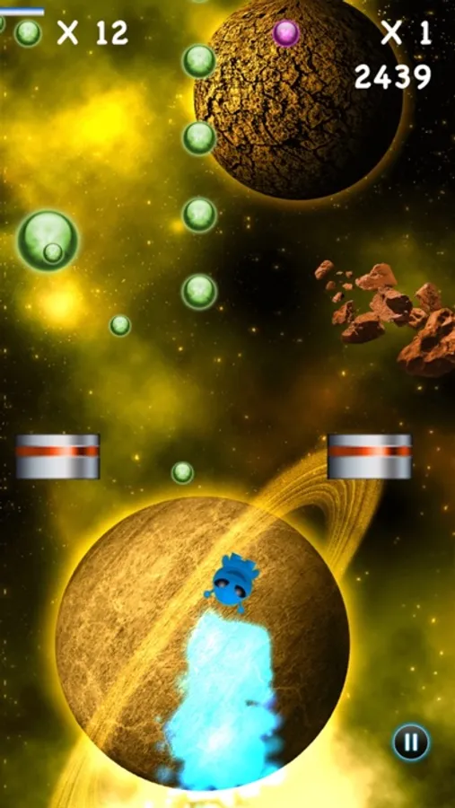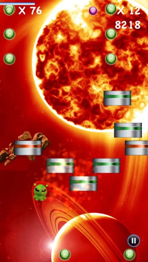 Tap the screen and tilt your phone steering the player through many gorgeous space scenery levels consisting of asteroids, stars and platforms. Collect green and purple stars to boost you up while consistently fighting gravity. Avoid falling by jumping on moving and exploding platforms. Collected stars can be used at the BiggzStore to buy additional players, each with their special ability. What are you waiting for get going and try out BiggzJump