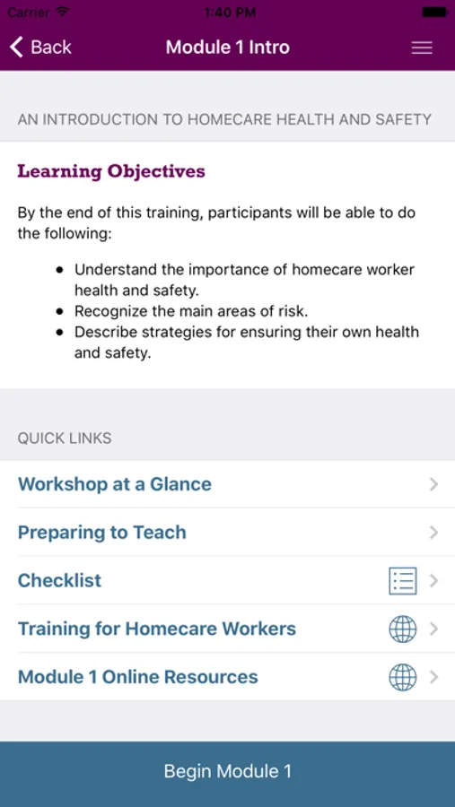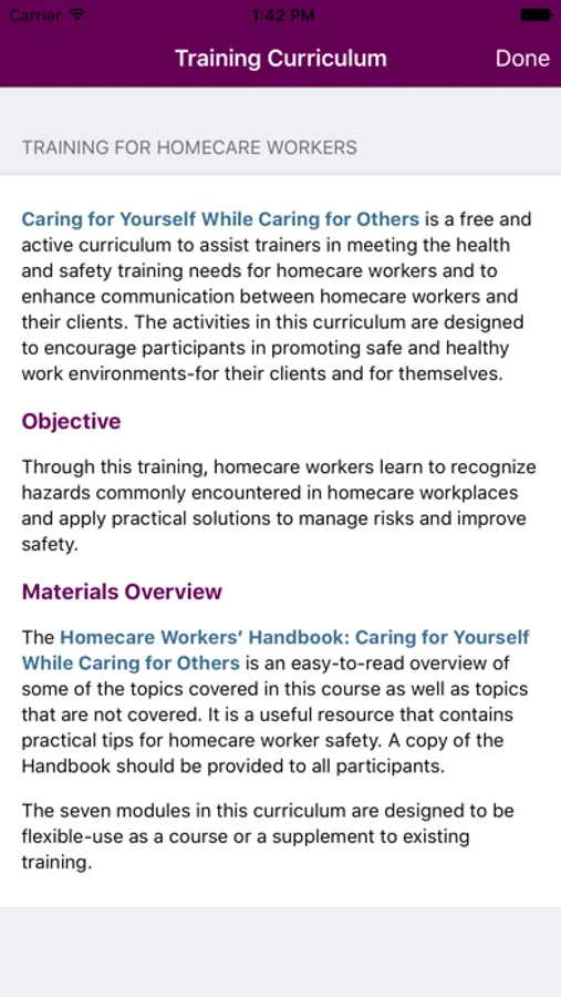 The CDC/NIOSH Caring for Yourself While Caring for Others Homecare Safety app serves as an electronic resource for trainers in delivering a free online seven-module safety and health training for homecare workers. This tool includes course preparation tips, lesson plans, supplies checklists, links to free course materials including slide presentations and participant handouts, and detailed delivery instructions for each of seven safety and health modules. Designed to be flexible, trainers may choose to deliver the entire seven modules of the curriculum or select individual modules to supplement existing training programs.