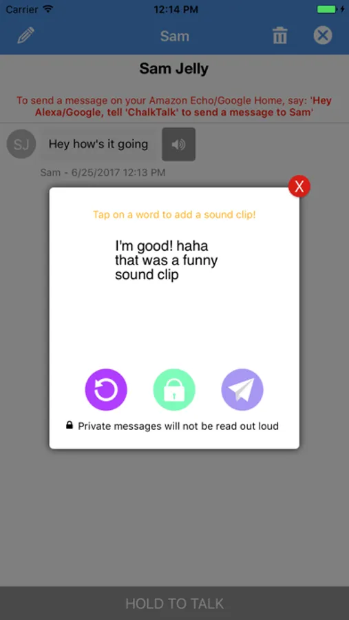 Your voice is powerful – make it fun! We imagine a world where sending and receiving a voice message is as fun, easy and addictive as using your favorite photo or selfie sharing or texting app…and is something that fits your life and is wherever you are. That’s right. ChalkTalk allows you to send and receive voice messages from your friends, family and network using any voice device, from and to anywhere – your phone, or any far field voice recognition device. Designed for simplicity, control and fun, with the convenience of being hands free and device agnostic. Now you can create, send and manage voice messages like never before. Communicate with your family or friends via phone or at home via voice recognition devices (“Tell Mom, I am running 10 mins late for dinner because of traffic” or “Tell Grandma, I’m busy cooking and I will call her back in 30 mins”).