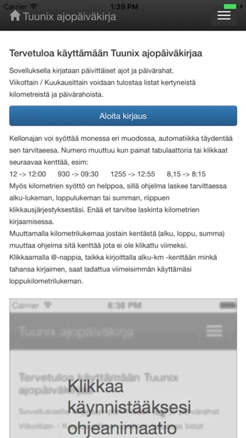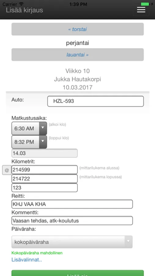 Sovelluksella kirjataan päivittäiset työajot ja päivärahat.