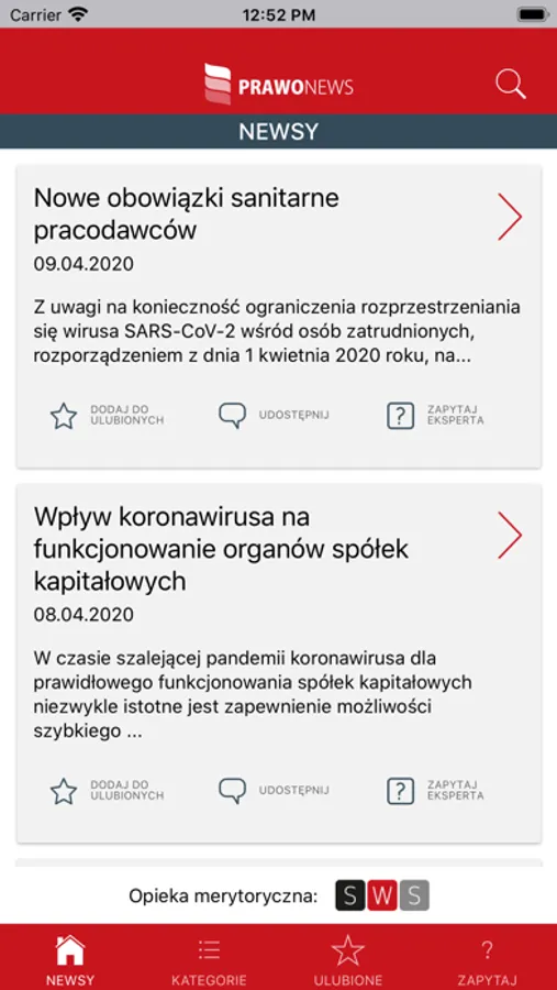 W aplikacji znajdziesz newsy podzielone na kategorie: