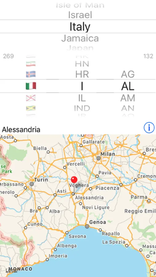 The app offers a selection for flags based by all available emojis, countries and country codes. If a flag is selected, the country and the car license plate are displayed. Depending on the country, the city codes and the corresponding cities are displayed and pinned on the map.
