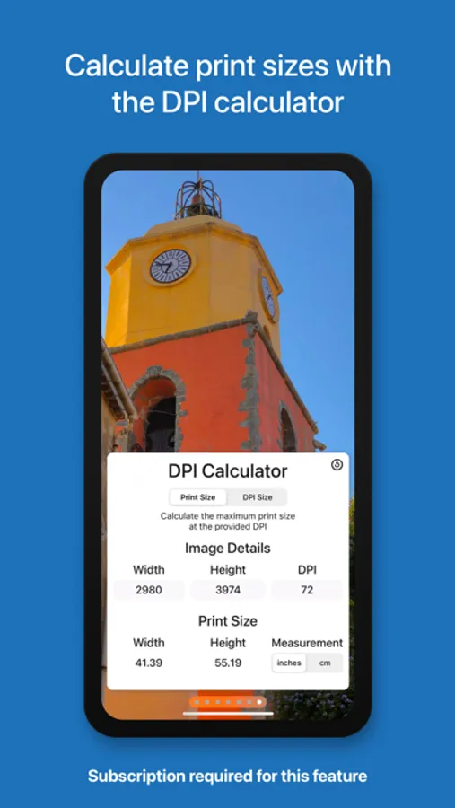 • Calculate the print size of your image using the DPI calculator, which can automatically calculate the print size based on the chosen image, or allows you to edit the Size and DPI values.