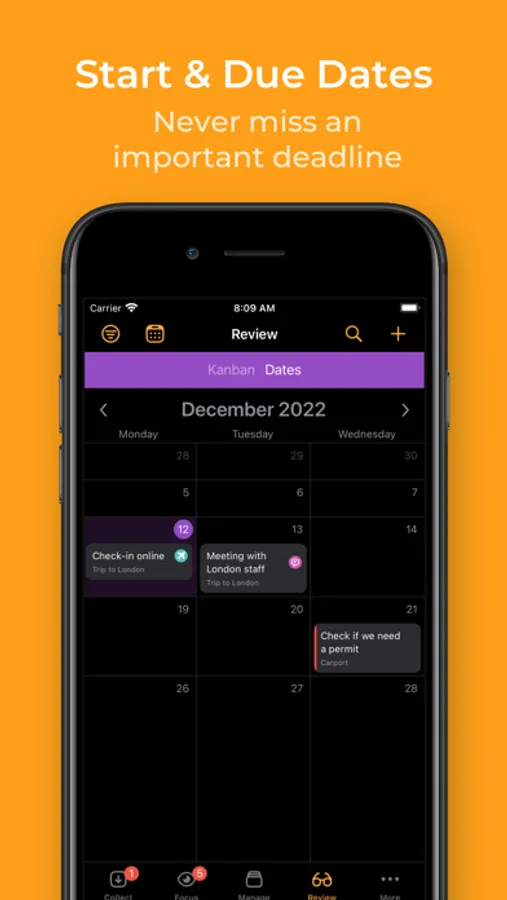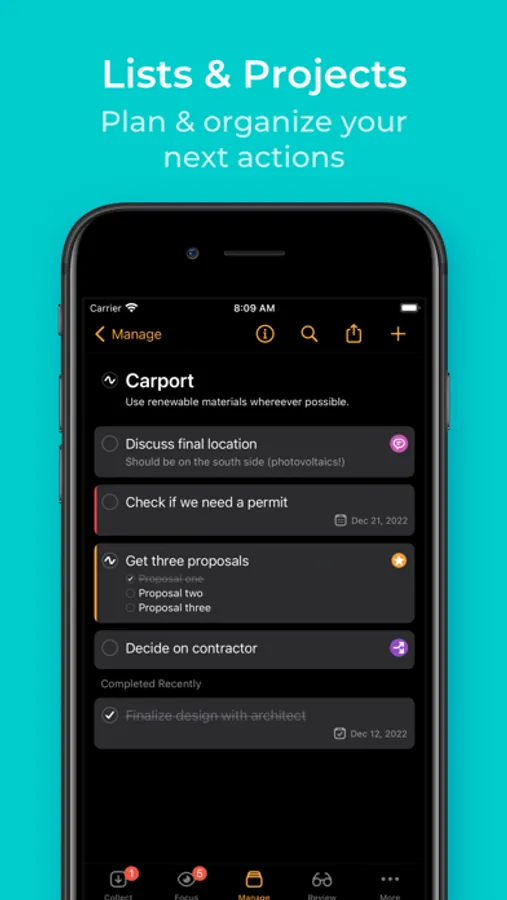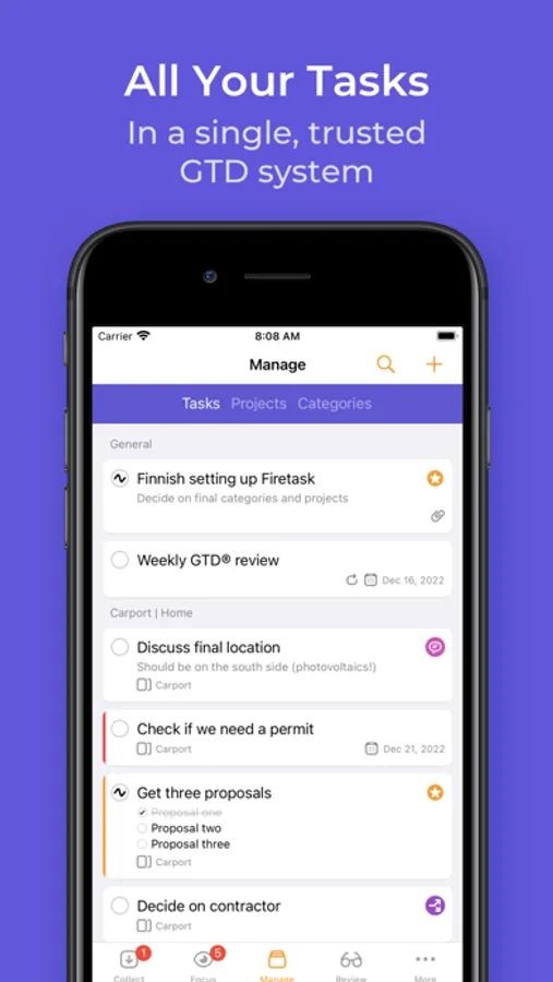 - Intuitive GTD Workflow. Easy, logical navigation based on the major GTD phases: Collect (Capture), Focus, Manage, and Review