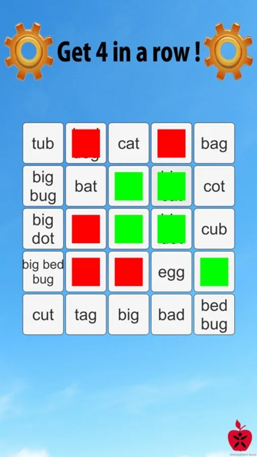 メニューをタッチすると、「陣取りゲーム、発音練習、カード練習」の三つのボタンが出てきます。陣取りゲームは四つを揃ったら勝ちという「Get 4 In A Row」ゲームです。発音練習はアルファベットの正しい発音を歌で覚えます。カード練習は発音練習で紹介されたアルファベットを言葉になります。おしゃべりながら楽しみながらフォニックスを覚えられる知育アプリです。