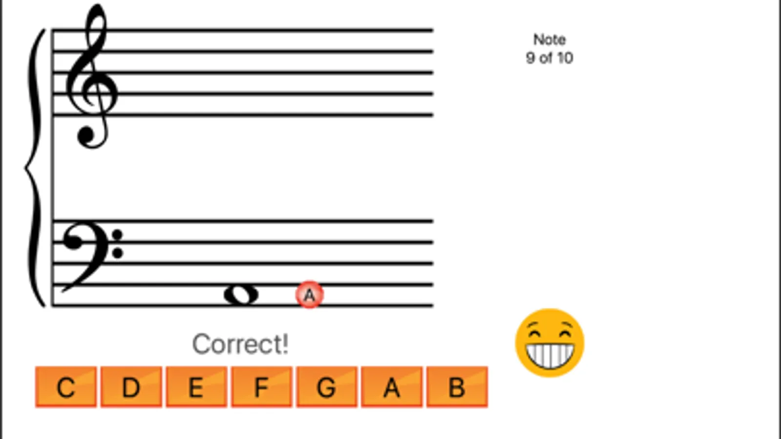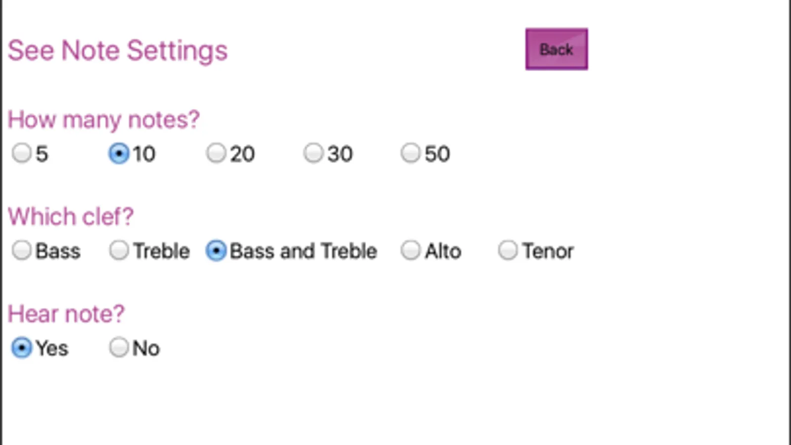 Prefer to work on just the treble clef or just the bass clef? Settings allow you to choose. You can even try alto or tenor clef. Settings also allow you to choose whether you hear the note and how many notes are in the set. Have fun with note identification!