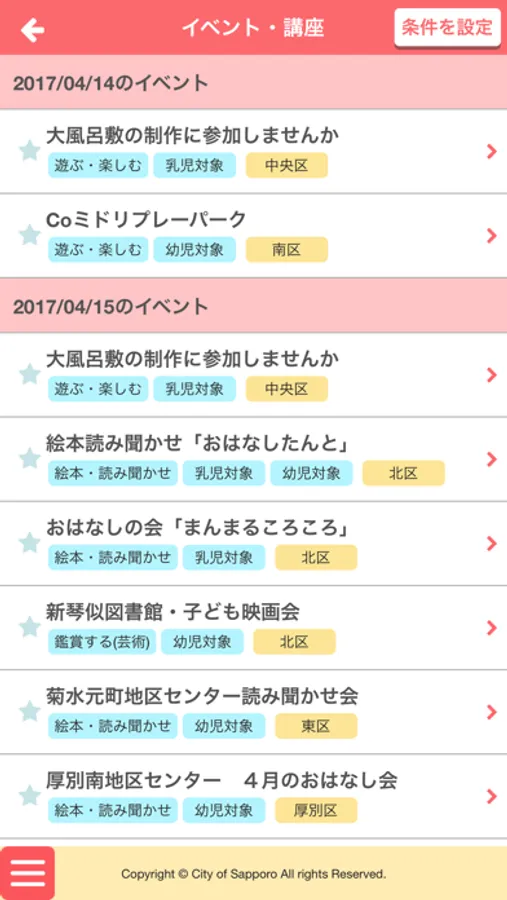札幌市の子育て世帯向けのイベントを簡単に検索できます。イベント種類やエリアからもチェック可能です。