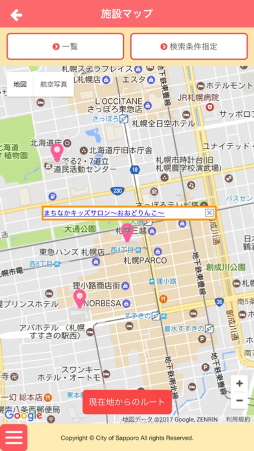 保育所や幼稚園、さらにはオムツ替え・授乳スペースがある公共施設等をマップで検索でき、現在地からのルート検索もできます。
