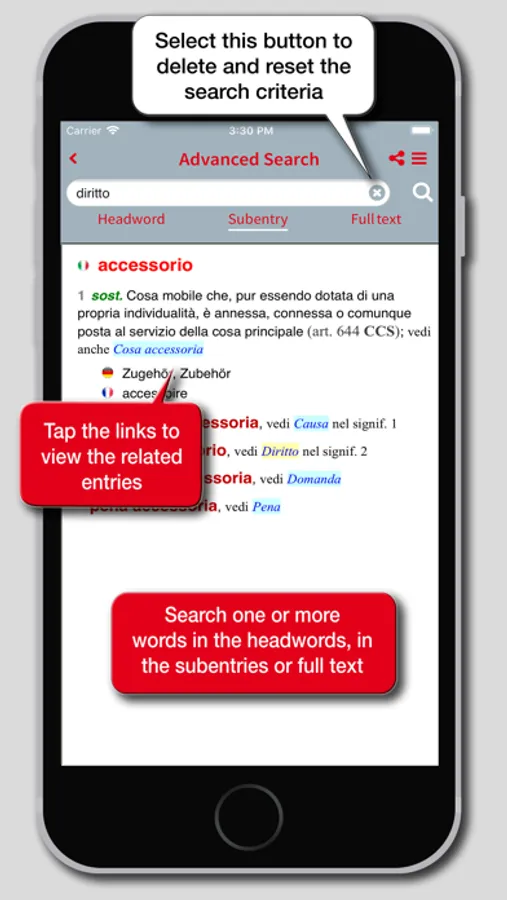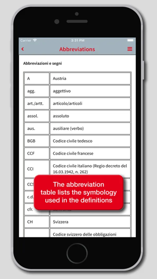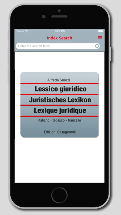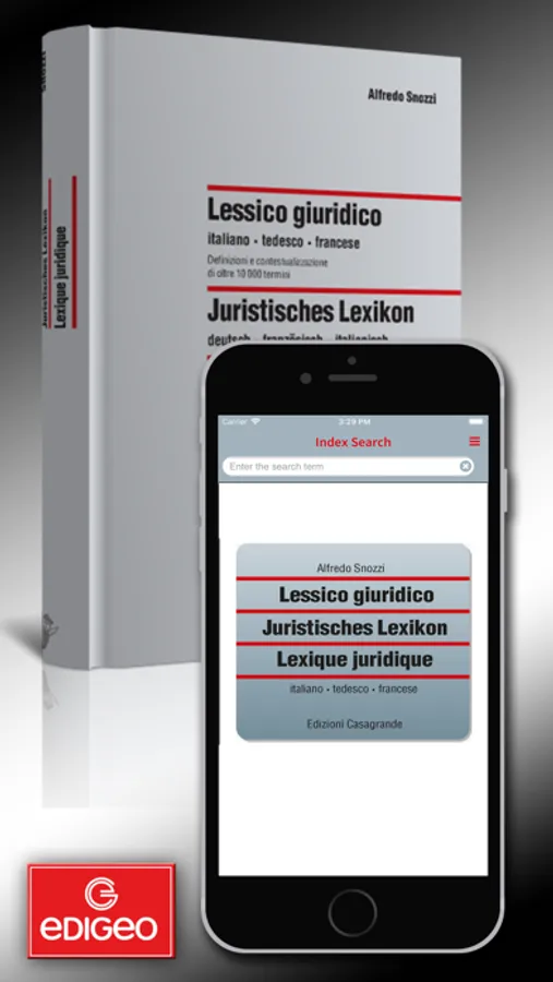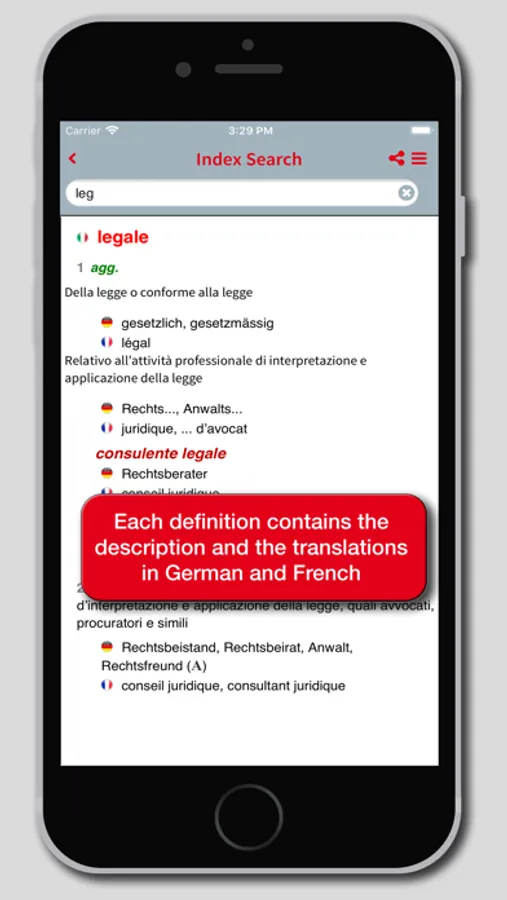 The app Legal Lexicon in 3 languages by Alfredo Snozzi is the first juridical trilingual dictionary (Italian-German-French), with more than 10.000 headwords and expressions taken from the juridical, political, and administrative language. Although pointed on the Italian and Swiss law systems, the data bank is full of links to legislations and juridical terminology of other European countries, mainly France and Germany. Because of its structure and content, it differs from traditional bilingual dictionaries as not only it is trilingual, but it also defines and contextualizes the individual headwords, indicating any different meanings..