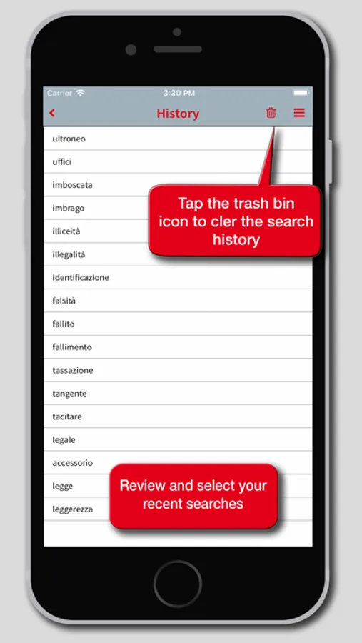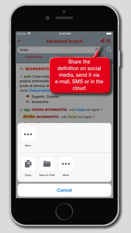 The app's interface has been redesigned to provide a simpler and more intuitive experience. Each definition can be shared using the features available in the device, such as social media, e-mail, SMS, cloud. A main menu that can be activated via an icon available at the top right of the screen enables all the features of the app: