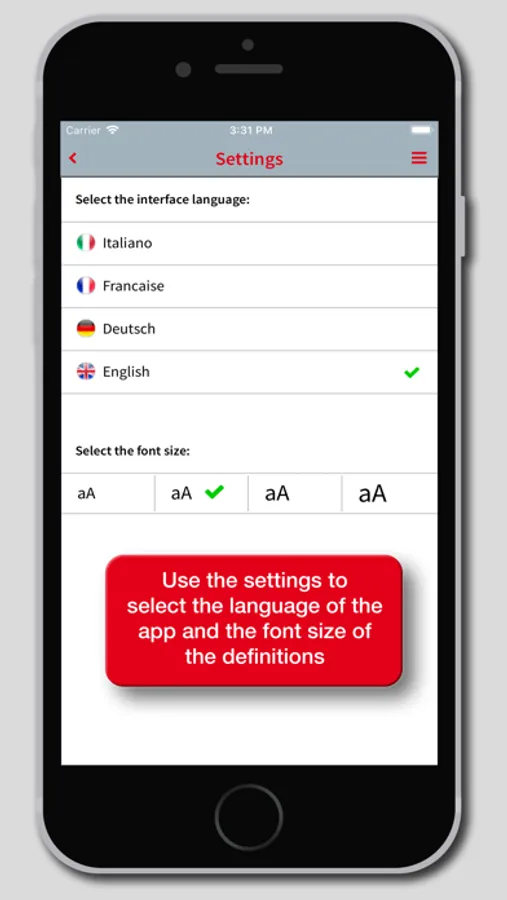 • Settings: allows you to choose the font size of the definitions and the language of the interface