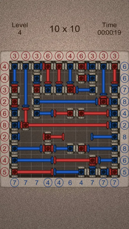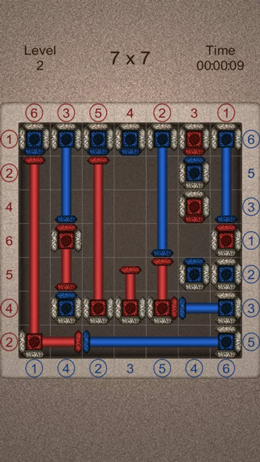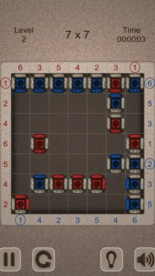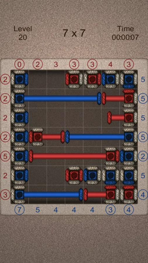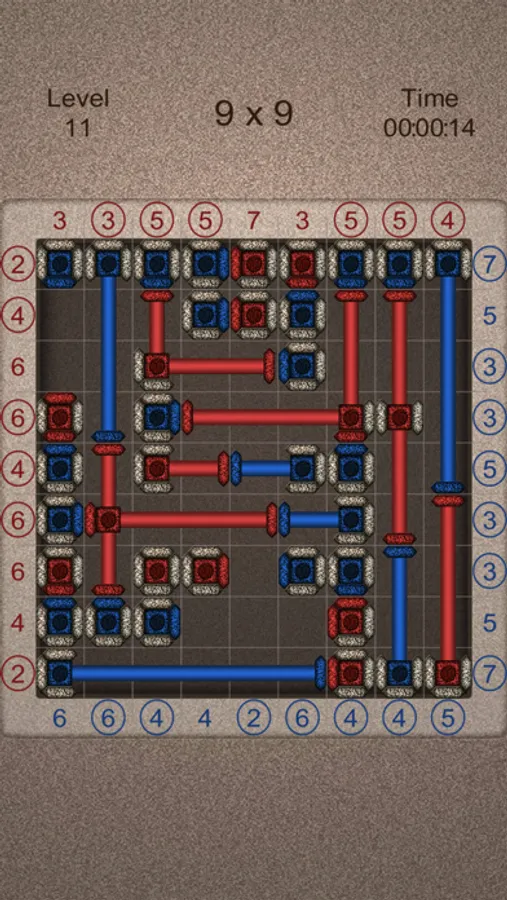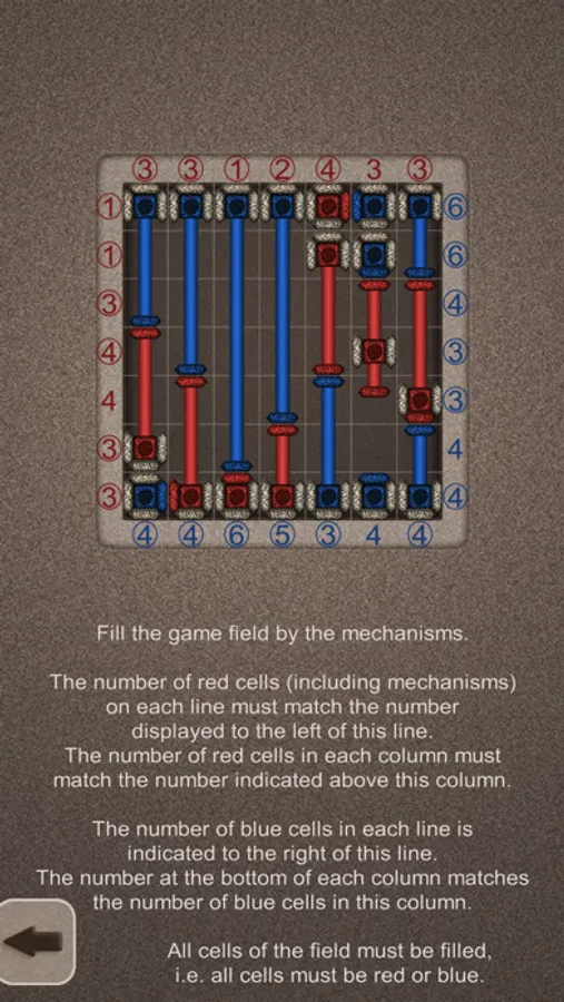 - The number of red cells (including mechanisms) on each line must match the number displayed to the left of this line.