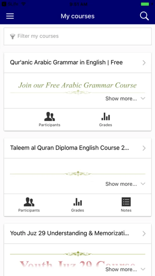 Your courses are listed with easy access to contents, participants, grades and notes. A useful filter field lets you find a particular course quickly. If your token expires during a session, you're prompted to re-enter your password and continue.