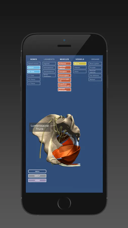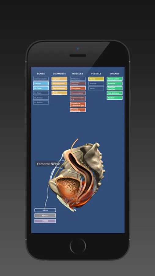 Based on a simple selection menu, users can navigate throughout the entire network of structures that comprise the male pelvic region, including the bony pelvis, pelvic floor, musculature, vessels, and connective tissue, and view their relationship to such organs as the bladder, reproductive organs, colon, and rectum. Structures can be rotated in 3D, made transparent or invisible, and viewed at different magnifications. The app also allows the arteries and nerves that traverse the pelvis to be clicked to trigger identifying text.